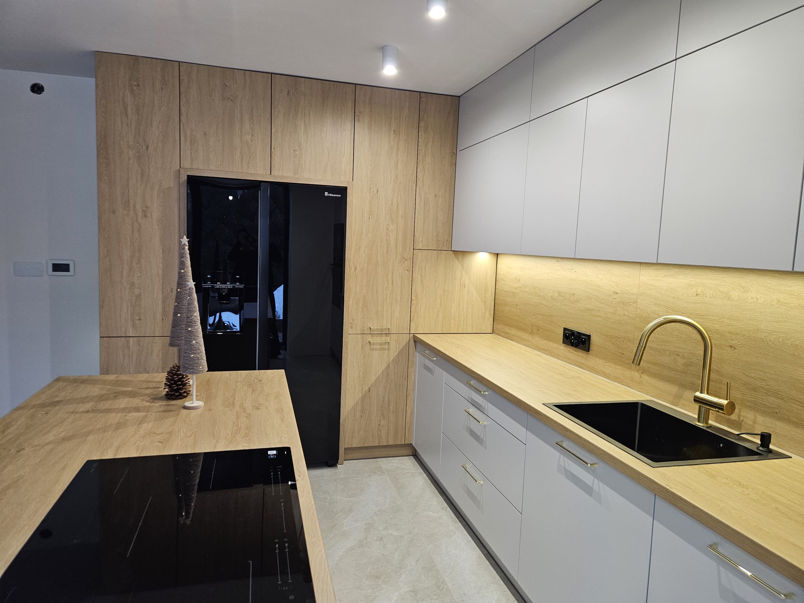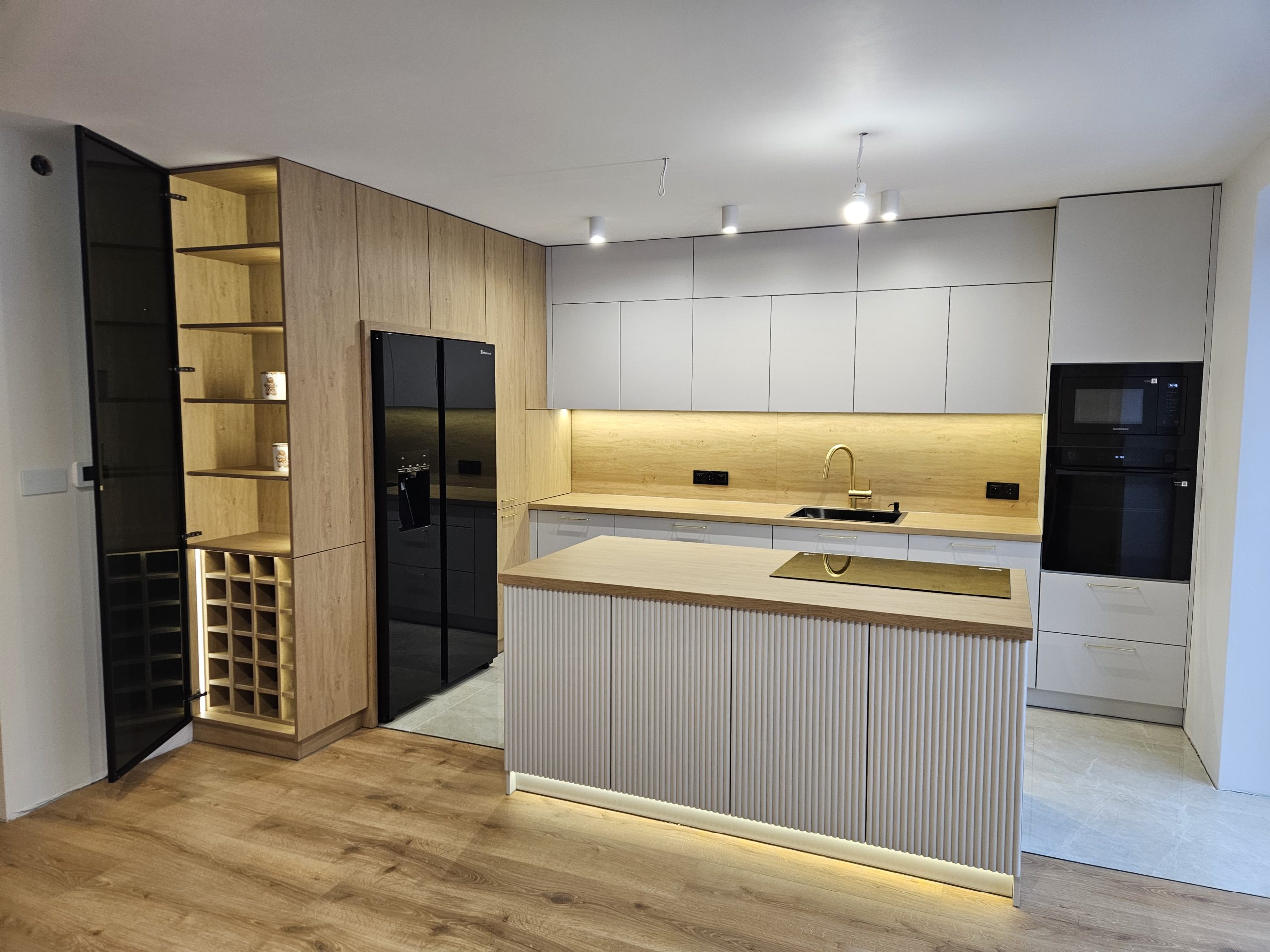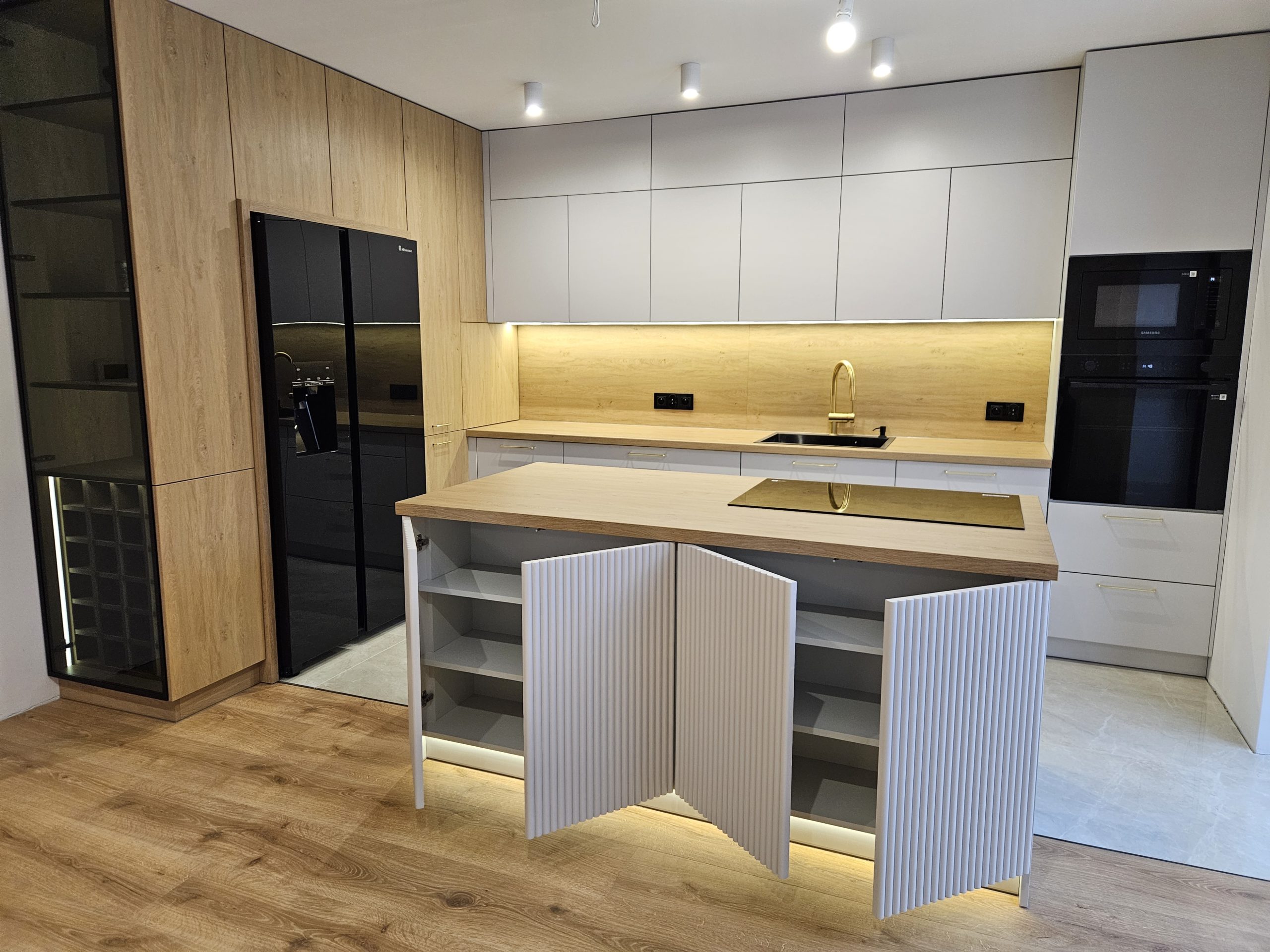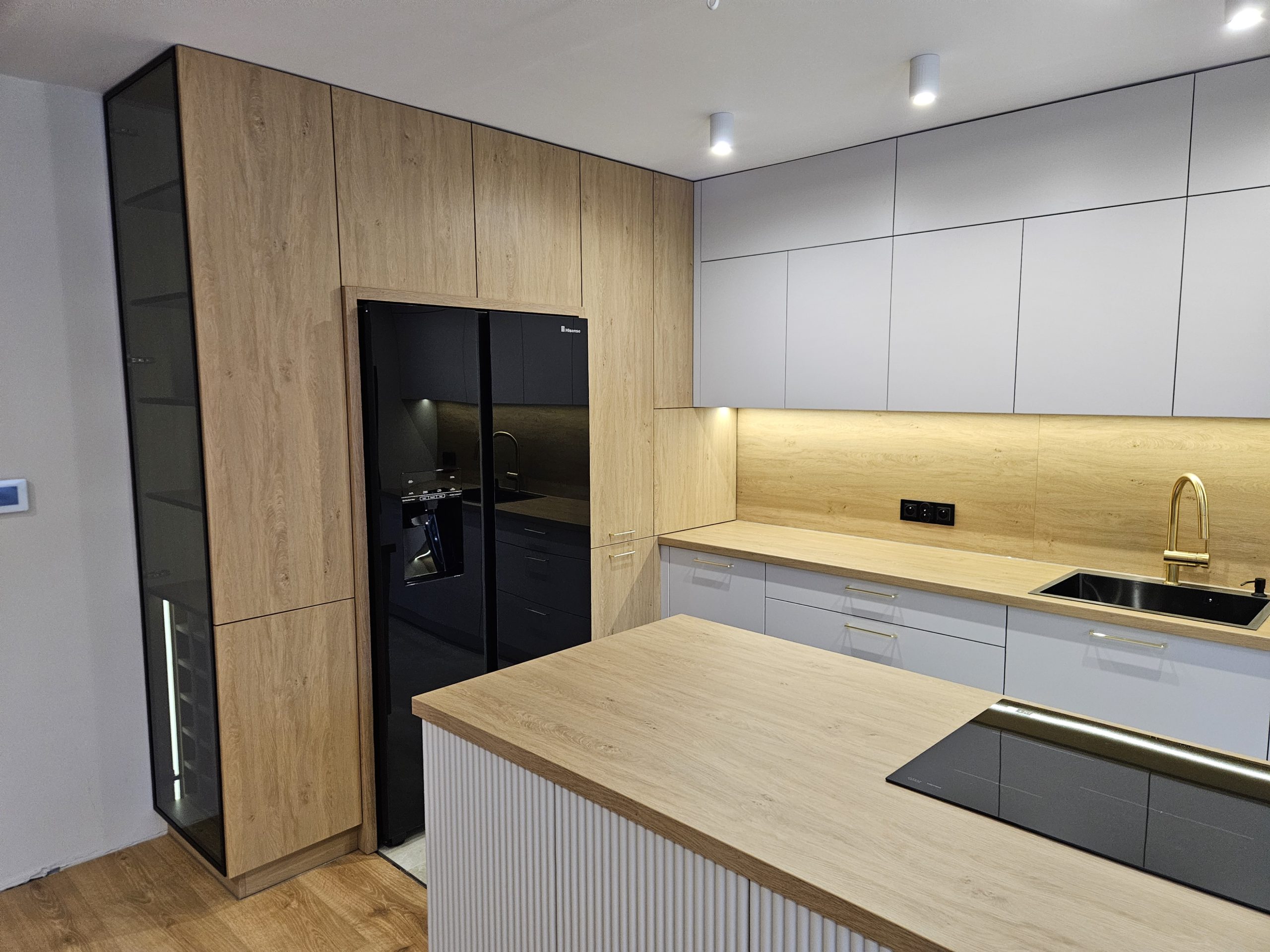 Ta kuchnia to połączenie kaszmirowych elementów lakierowanych z drewnianymi. Kuchnia Inga wykorzystuje plusy pomieszczenia otwartego na salon; posiada przeszkloną, podświetloną witrynę, zabudowę do sufitu, wiele solidnych, szerokich szuflad, szafkę na zapasy obok lodówki, czy szafkę na wysuwany expres. Za ryflowanymi frontami wyspy skrywają się półki, być może na dodatkową zastawę ? Ciekawostką w tej kuchni jest podświetlenie LED , które kontrolowane jest czterostrefowym pilotem. Każda ze stref może mieć inne natężenie oświetlenia 🙂