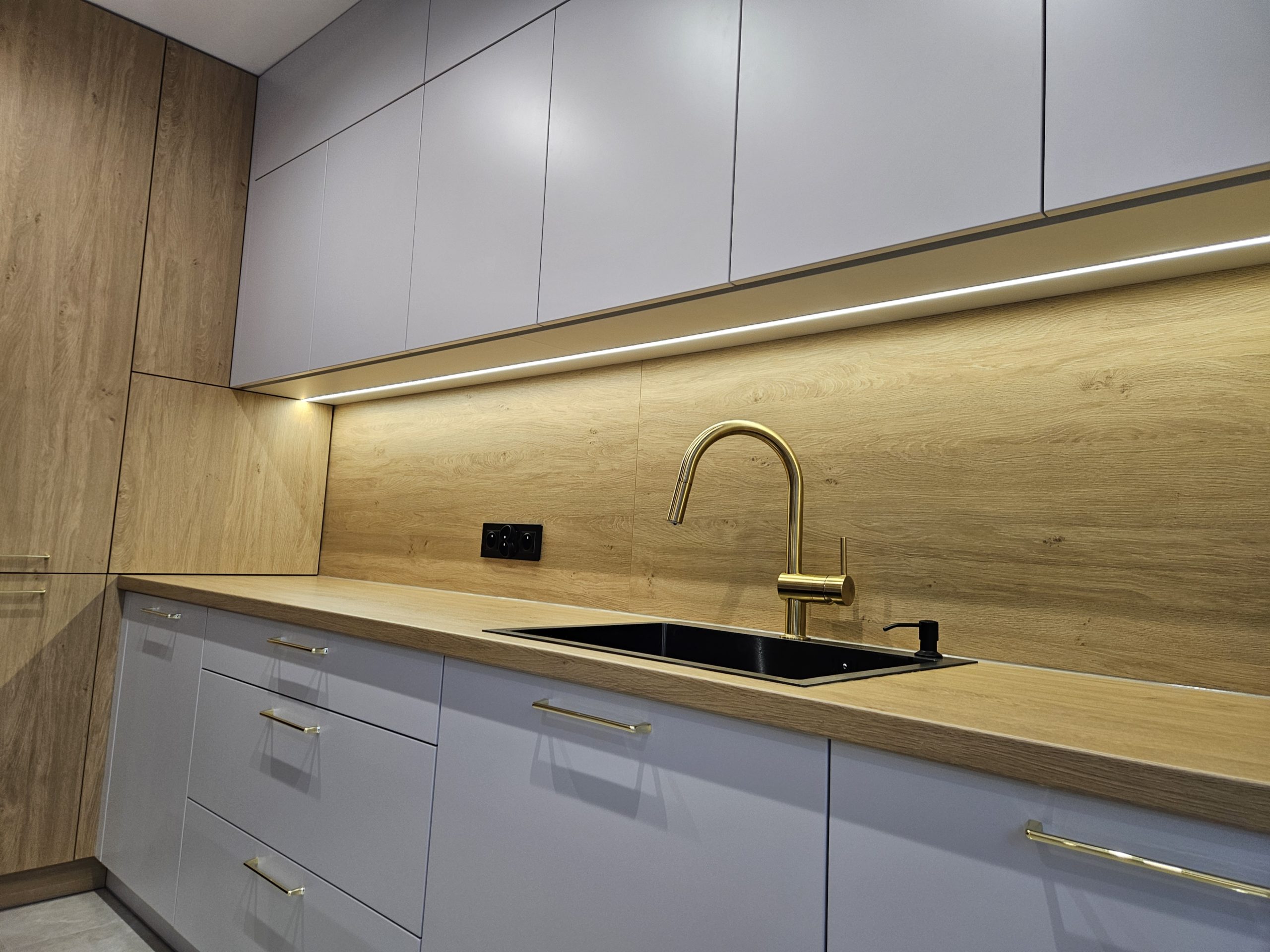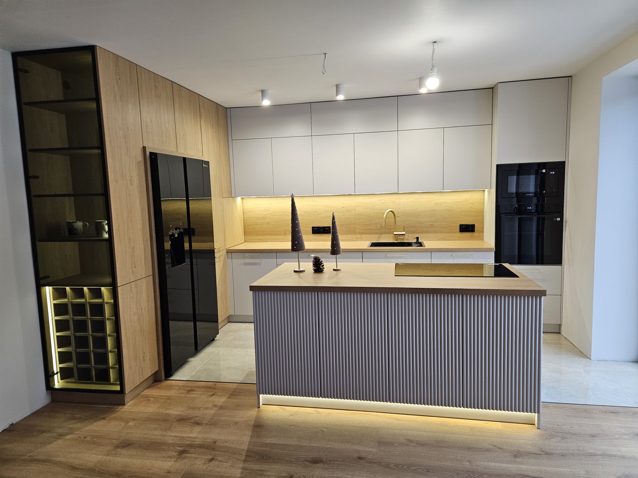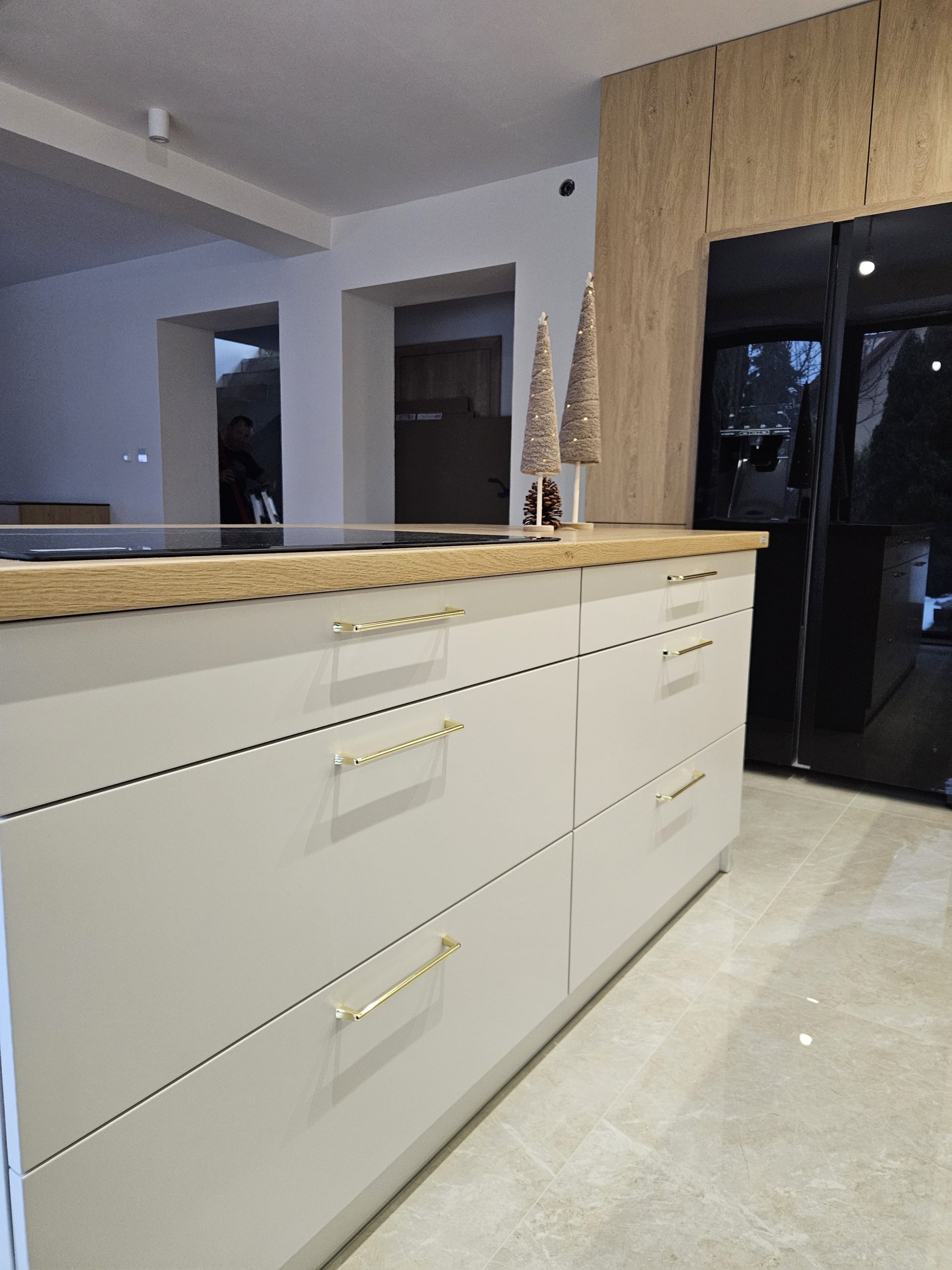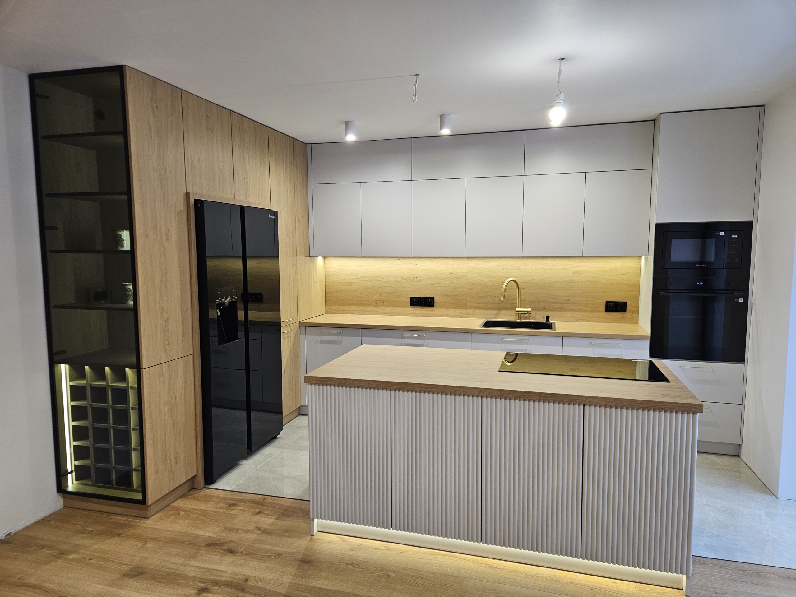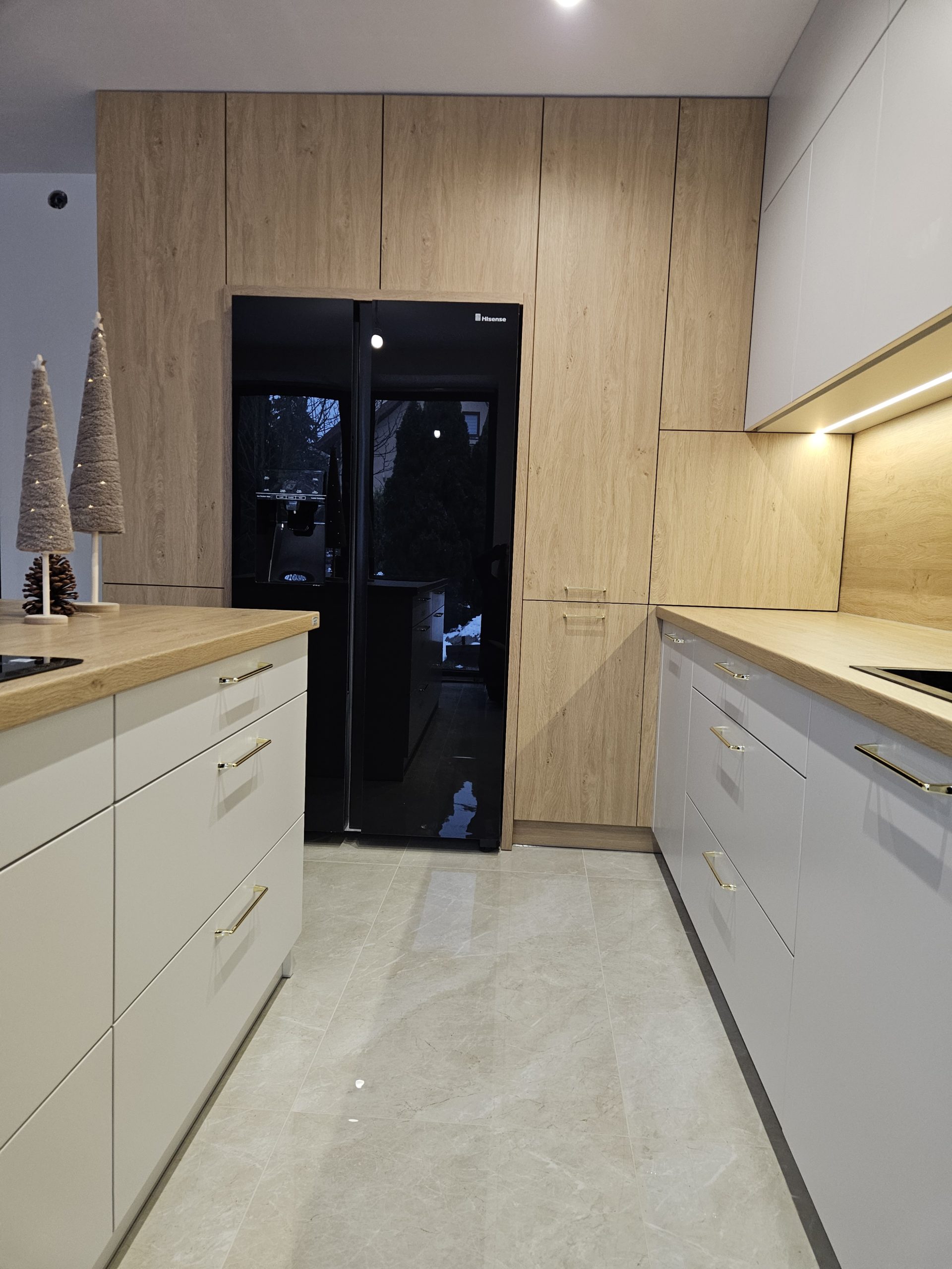 Ta kuchnia to połączenie kaszmirowych elementów lakierowanych z drewnianymi. Kuchnia Inga wykorzystuje plusy pomieszczenia otwartego na salon; posiada przeszkloną, podświetloną witrynę, zabudowę do sufitu, wiele solidnych, szerokich szuflad, szafkę na zapasy obok lodówki, czy szafkę na wysuwany expres. Za ryflowanymi frontami wyspy skrywają się półki, być może na dodatkową zastawę ? Ciekawostką w tej kuchni jest podświetlenie LED , które kontrolowane jest czterostrefowym pilotem. Każda ze stref może mieć inne natężenie oświetlenia 🙂